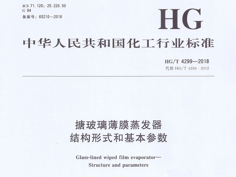 無錫錢橋化工機(jī)械有限公司參與起草中華人民共和國(guó)化工行業(yè)標(biāo)準(zhǔn)HG/T 4299-2018《搪玻璃薄膜蒸發(fā)器結(jié)構(gòu)形式和基本參數(shù)。 ...