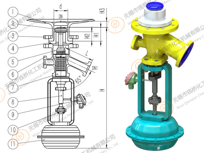 Bottom outlet valve (65°) gap free with pneumatic actuator.搪玻璃上展式自動(dòng)放料閥 *內(nèi)置測(cè)溫氣動(dòng)放料閥Can not be used for liquids containing fluoride ions (such as hydrofluoric acid, etc.), nor can it be used for strong alkalis and concentrated phosphoric acid with a temperat